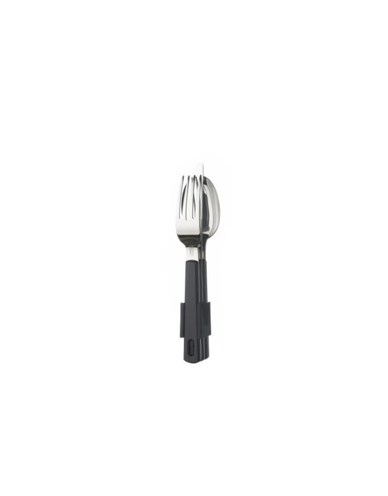 Oceankleurige (blauwe) bestekset van Mepal, bestaande uit een vork, mes en lepel. Een clip houdt dit driedelige kampeerbestek netjes bij elkaar. Super handig!